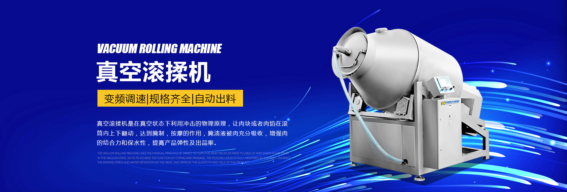 公司主要生產(chǎn)不銹鋼制品食品機械:各種規(guī)格型號真空滾揉機、制冷滾揉機、提升機、電加熱夾層鍋、肉丸機、真空攪拌機、絞肉機、灌腸機、打卡機、線扎機、斬拌機、鹽水注射機、煙熏爐、油炸機、巴氏殺菌線、連續(xù)油炸線、肉丸成型水煮線、醬鹵生產(chǎn)線、肉丸破碎機、真空包裝機、洗袋風干機、豬頭劈半機、不銹鋼火腿模具、肉斗車、案桌、煙熏車、屠宰類機械設(shè)備、清洗風干設(shè)備、肉類解凍設(shè)備、滾筒拌料機等。產(chǎn)品廣泛適用于火腿腸、肉丸、肉串、鹵制品、海產(chǎn)品、禽類深加工、油炸、泡椒風味、速凍水餃、魚豆腐、千葉豆腐、豆腐干、牛肉干、牛排雞排類、禽蛋、麻辣、休閑、水果蔬菜清洗、中央廚房、餐飲連鎖、寵物食品等食品生產(chǎn)。